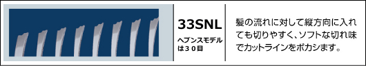 クシ刃の形状は33SNL DURタイプ(HVT30は30目)でヌケもよく、連続使用に優れた操作性があります。また独自のシンメトリータイプのオリジナルハンドルは、ひっくり返しての逆刃仕様(リバーシブル)にも対応しています。